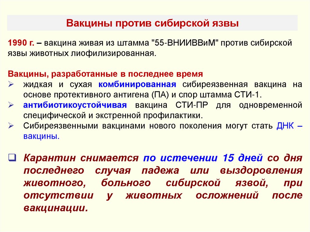 Вакцины против сибирской язвы1990 г. – вакцина живая из штамма "55-ВНИИВВиМ" против сибирской