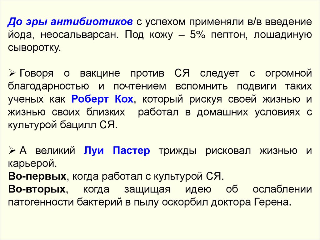 До эры антибиотиков с успехом применяли в/в введениейода, неосальварсан. Под кожу – 5% пептон, лошадиную