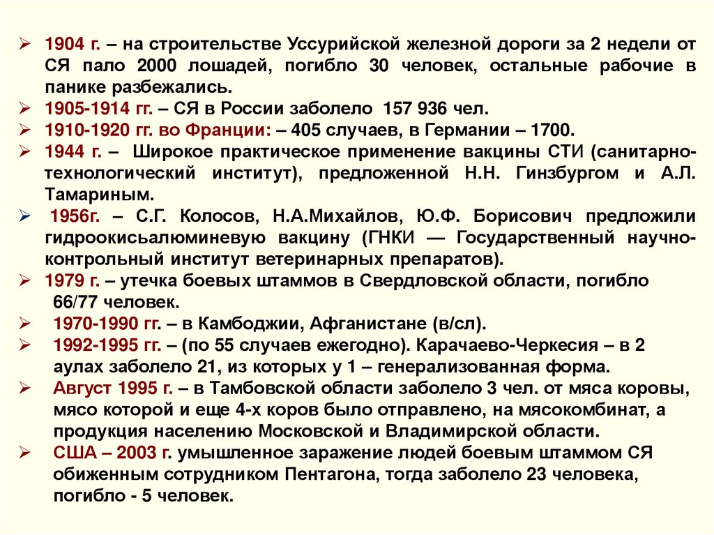 1880 г. – первое сообщение о СЯ человека сделано в СПетербурге гл. врачом Обуховской больницы Германом.