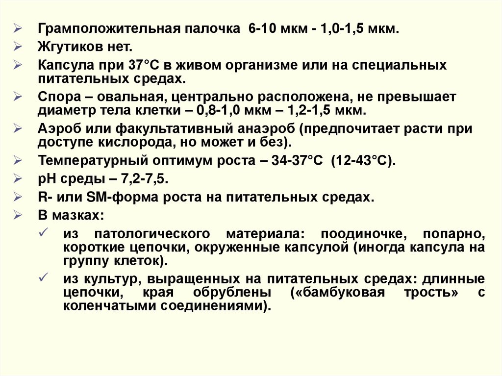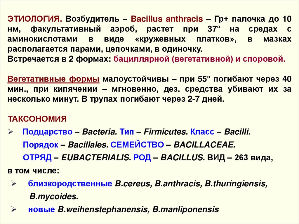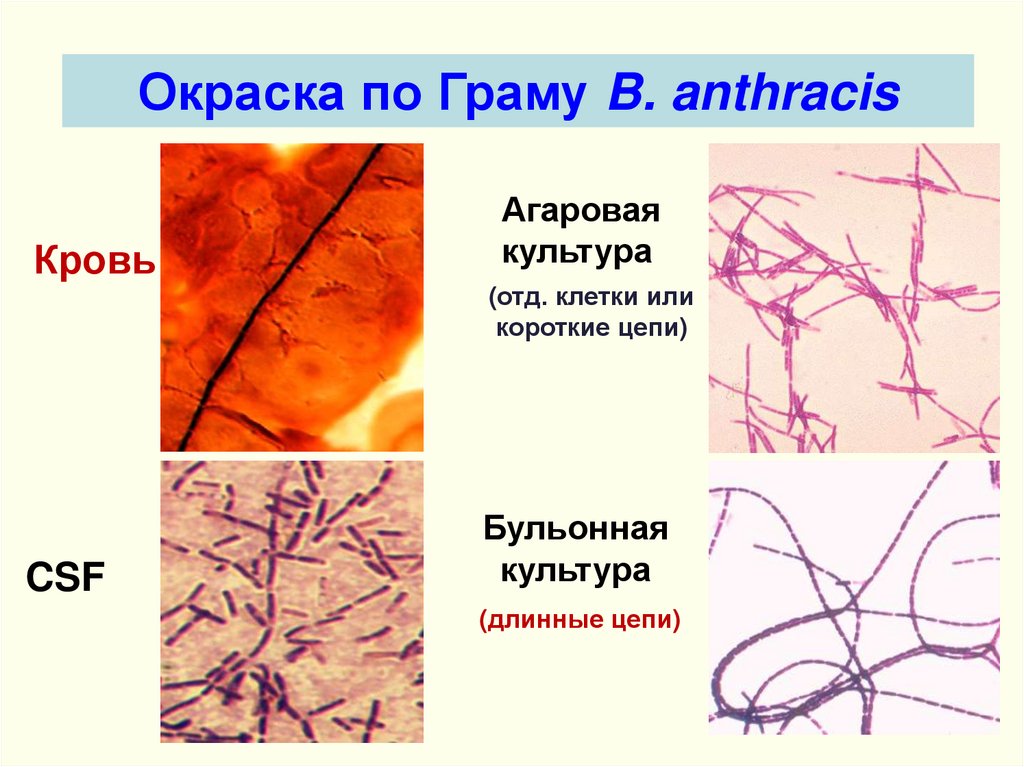 ЭТИОЛОГИЯ. Возбудитель – Bacillus anthracis – Гр+ палочка до 10нм, факультативный аэроб, растет при 37° на средах с