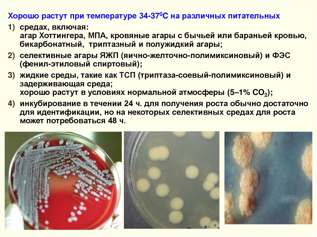 Температурный оптимум роста – 34-37°С (12-43°С).