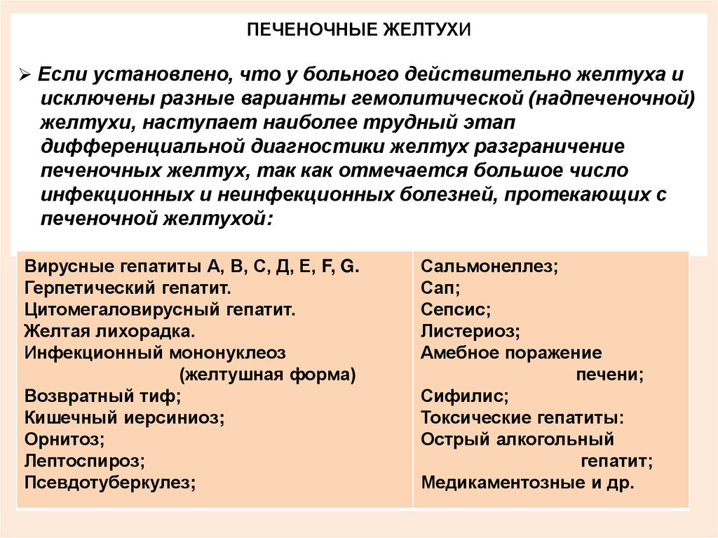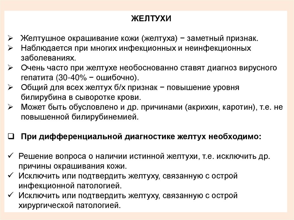 Решение вопроса о наличии истинной желтухи, т.е. исключить др.