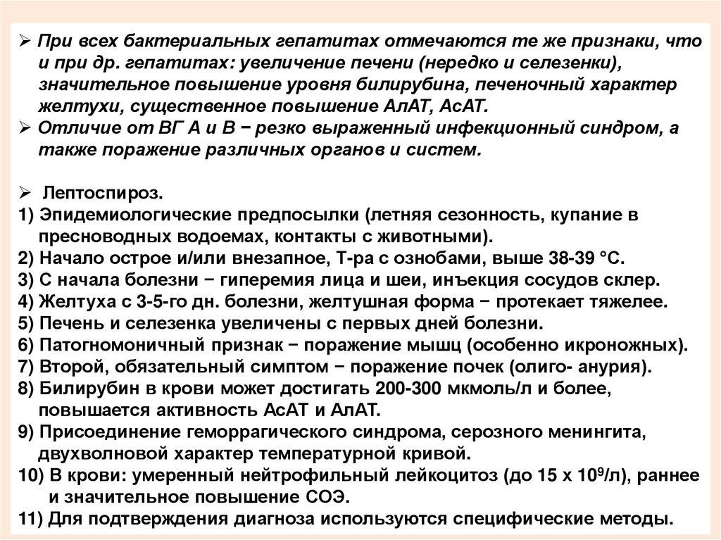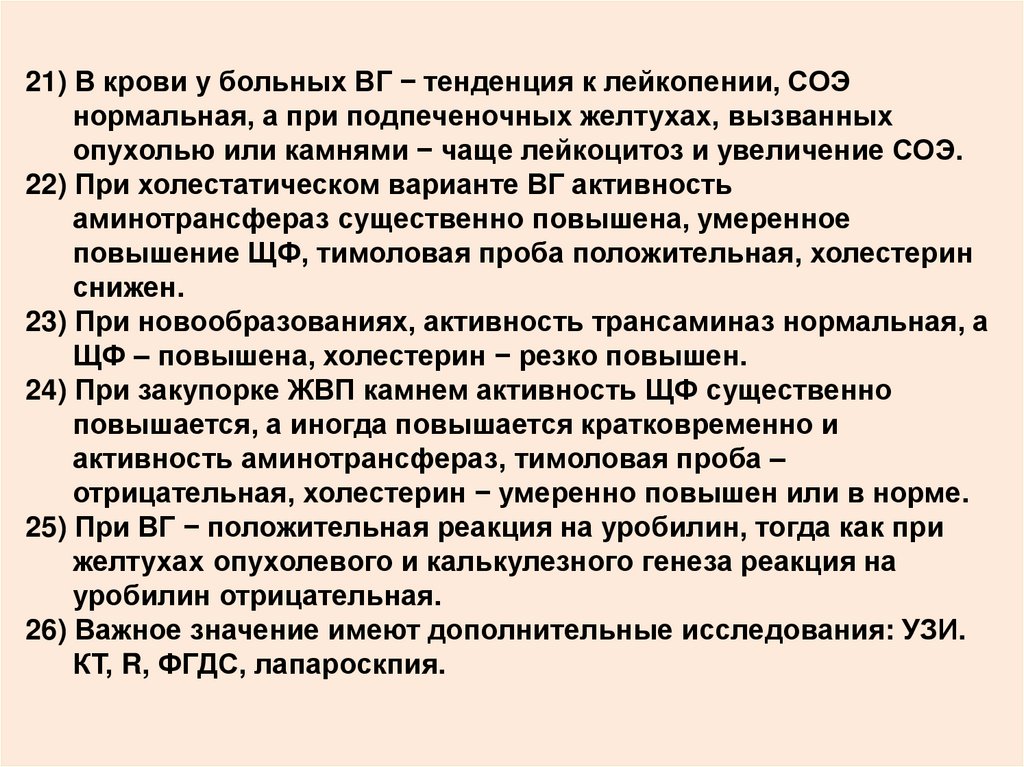 21) В крови у больных ВГ − тенденция к лейкопении, СОЭнормальная, а при подпеченочных желтухах, вызванных
