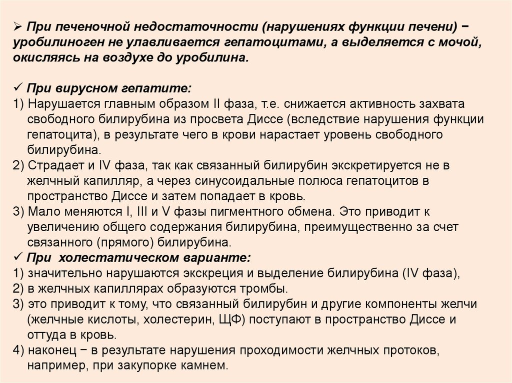 При печеночной недостаточности (нарушениях функции печени) −уробилиноген не улавливается гепатоцитами, а выделяется с мочой,