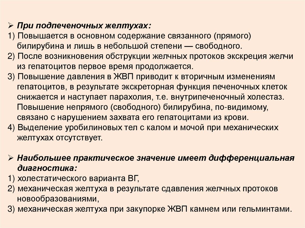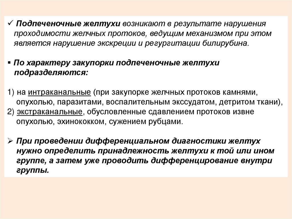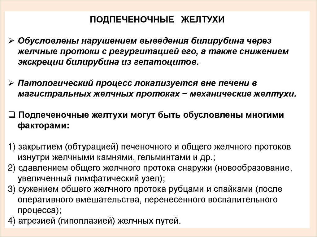 Подпеченочные желтухи возникают в результате нарушенияпроходимости желчных протоков, ведущим механизмом при этом