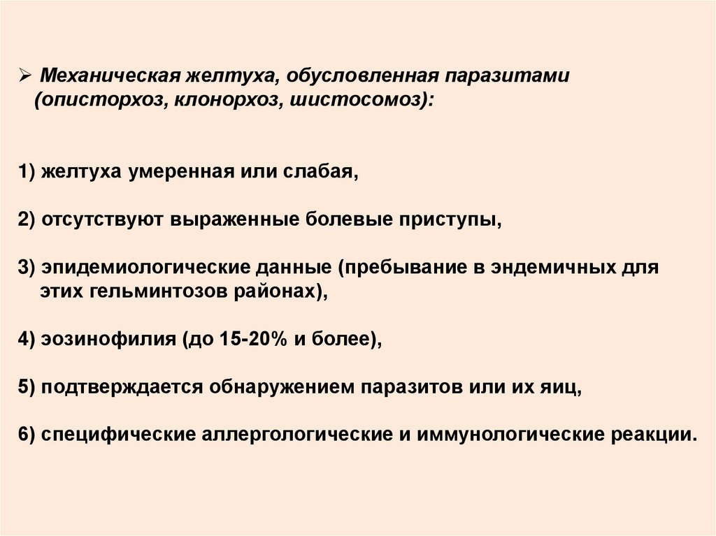 Механическая желтуха, обусловленная паразитами(описторхоз, клонорхоз, шистосомоз):