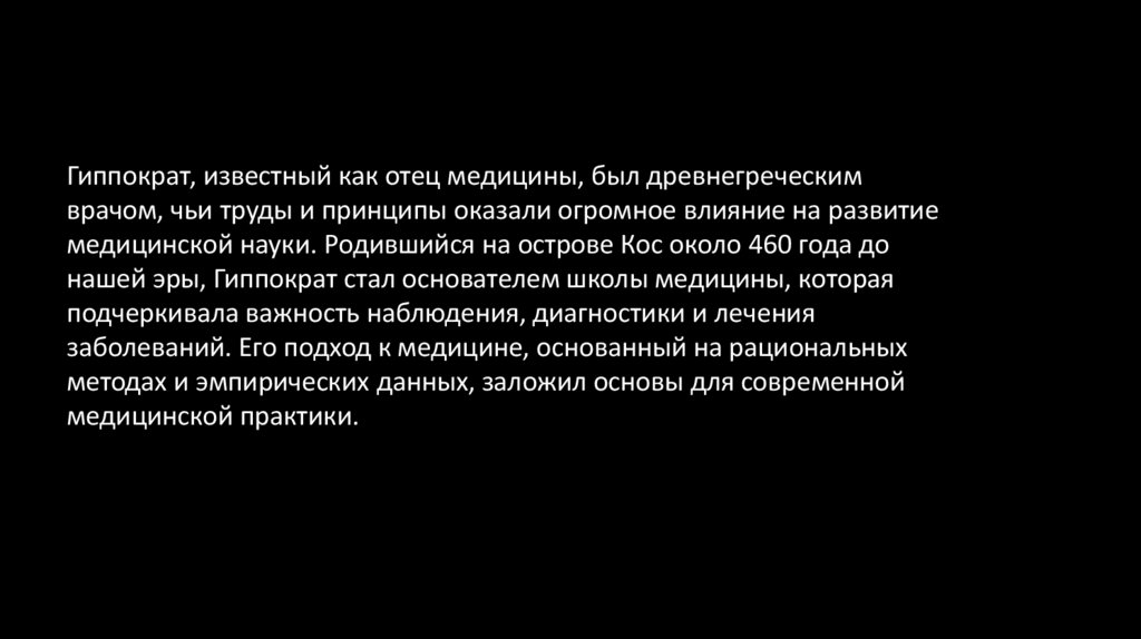 Гиппократ, известный как отец медицины, был древнегреческимврачом, чьи труды и принципы оказали огромное влияние на развитие