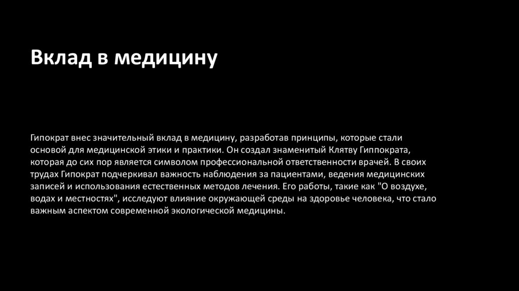 Вклад в медицинуГипократ внес значительный вклад в медицину, разработав принципы, которые стали