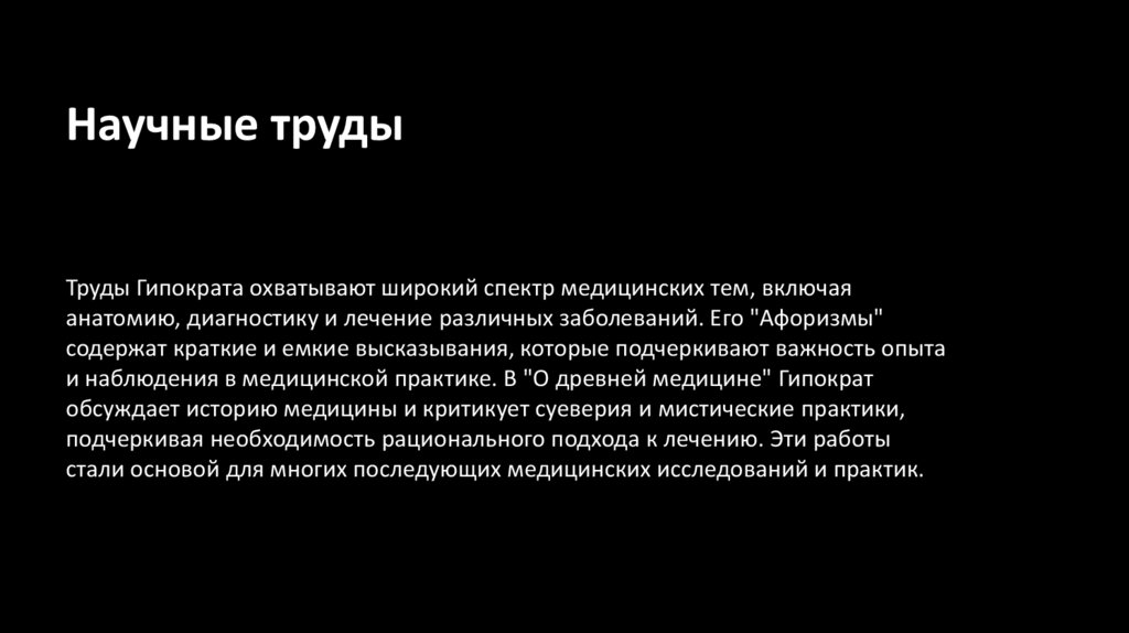 Научные трудыТруды Гипократа охватывают широкий спектр медицинских тем, включая