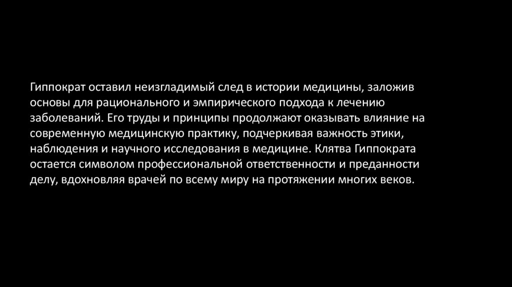 Гиппократ оставил неизгладимый след в истории медицины, заложивосновы для рационального и эмпирического подхода к лечению