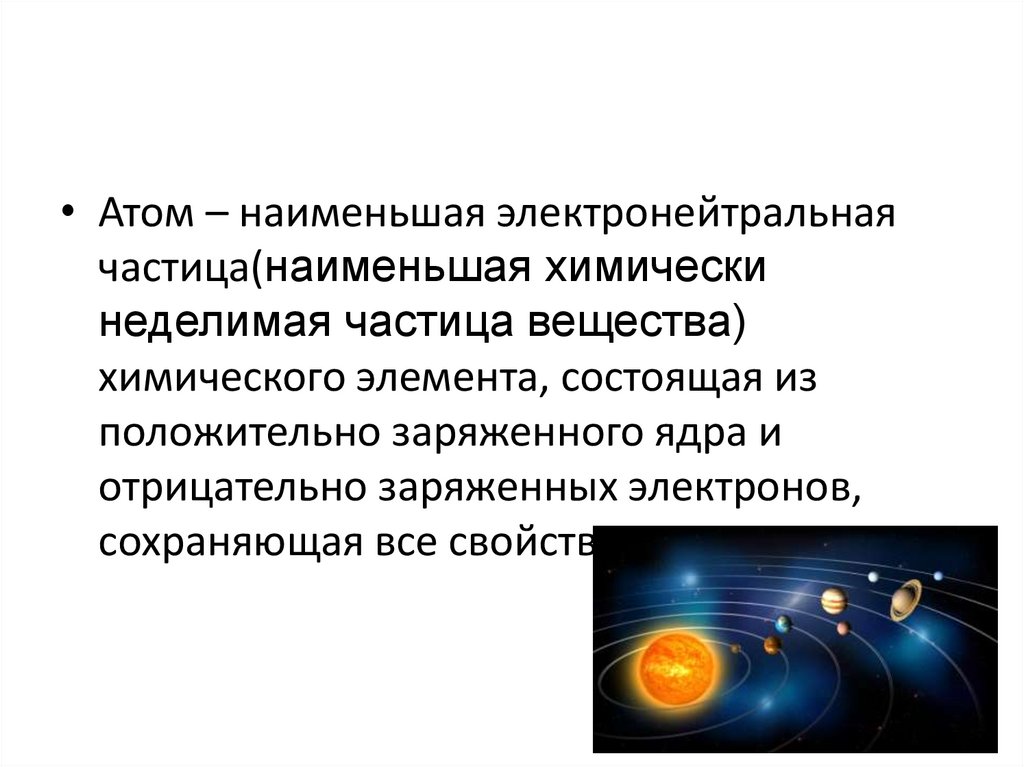 • Атом – наименьшая электронейтральнаячастица(наименьшая химически