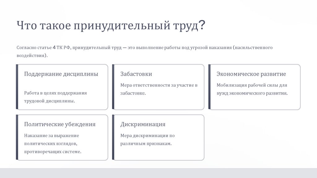 Что такое принудительный труд?Согласно статье 4 ТК РФ, принудительный труд — это выполнение работы под угрозой наказания (насильственного
