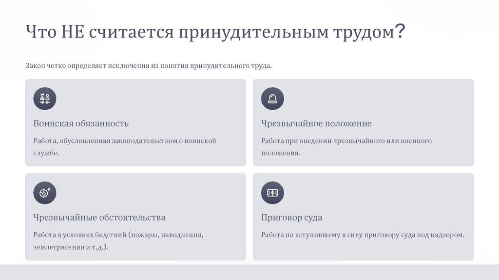 Что НЕ считается принудительным трудом?Закон четко определяет исключения из понятия принудительного труда.