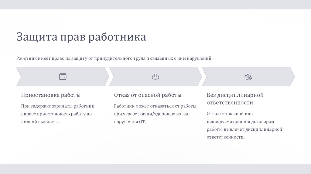 Защита прав работникаРаботник имеет право на защиту от принудительного труда и связанных с ним нарушений.