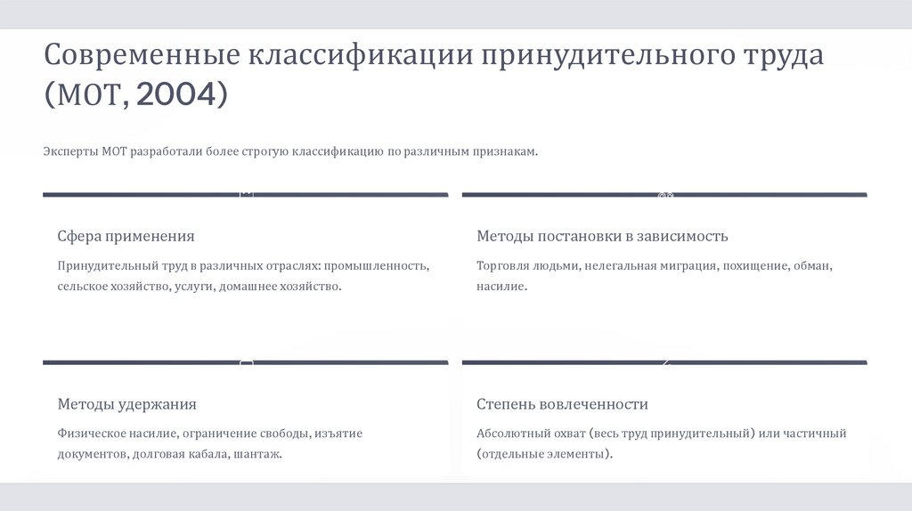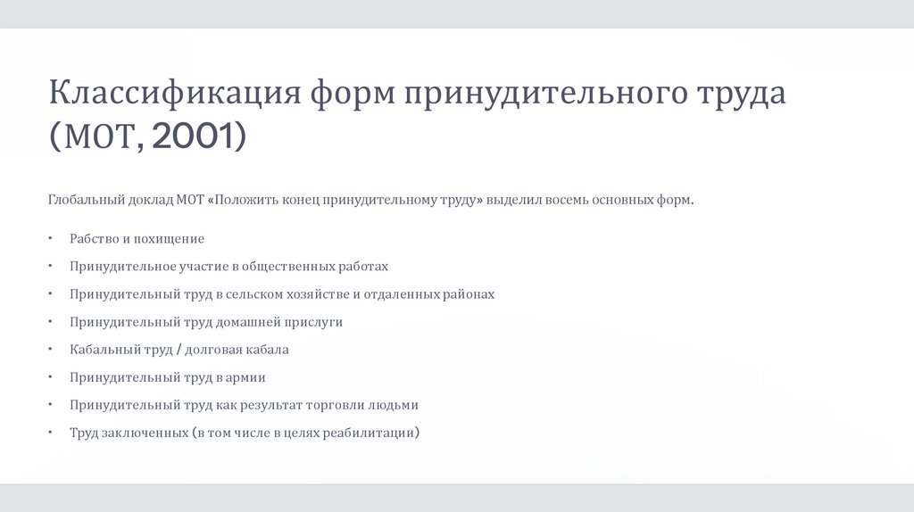 Глобальный доклад МОТ «Положить конец принудительному труду» выделил восемь основных форм.