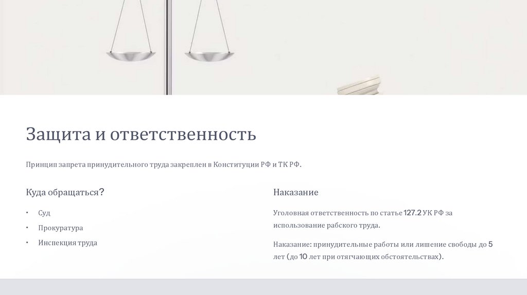 Защита и ответственностьПринцип запрета принудительного труда закреплен в Конституции РФ и ТК РФ.