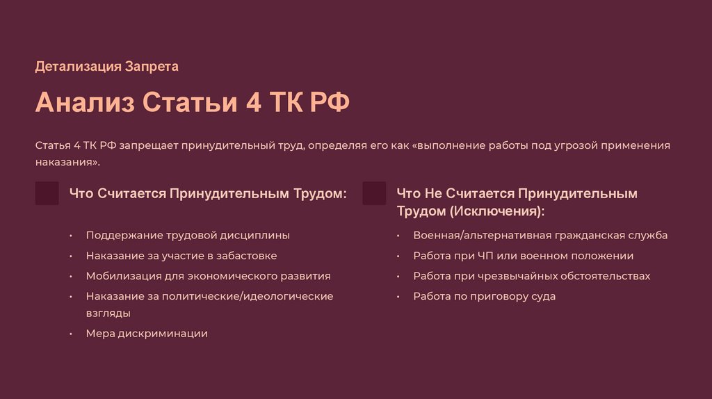Статья 4 ТК РФ запрещает принудительный труд, определяя его как «выполнение работы под угрозой применения