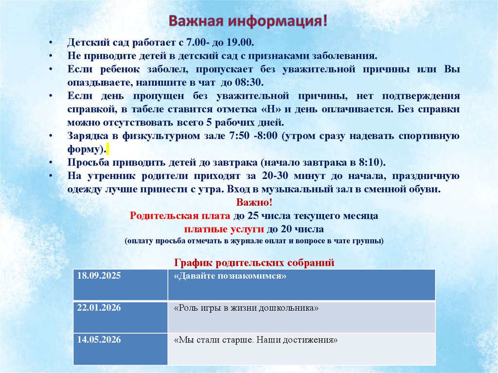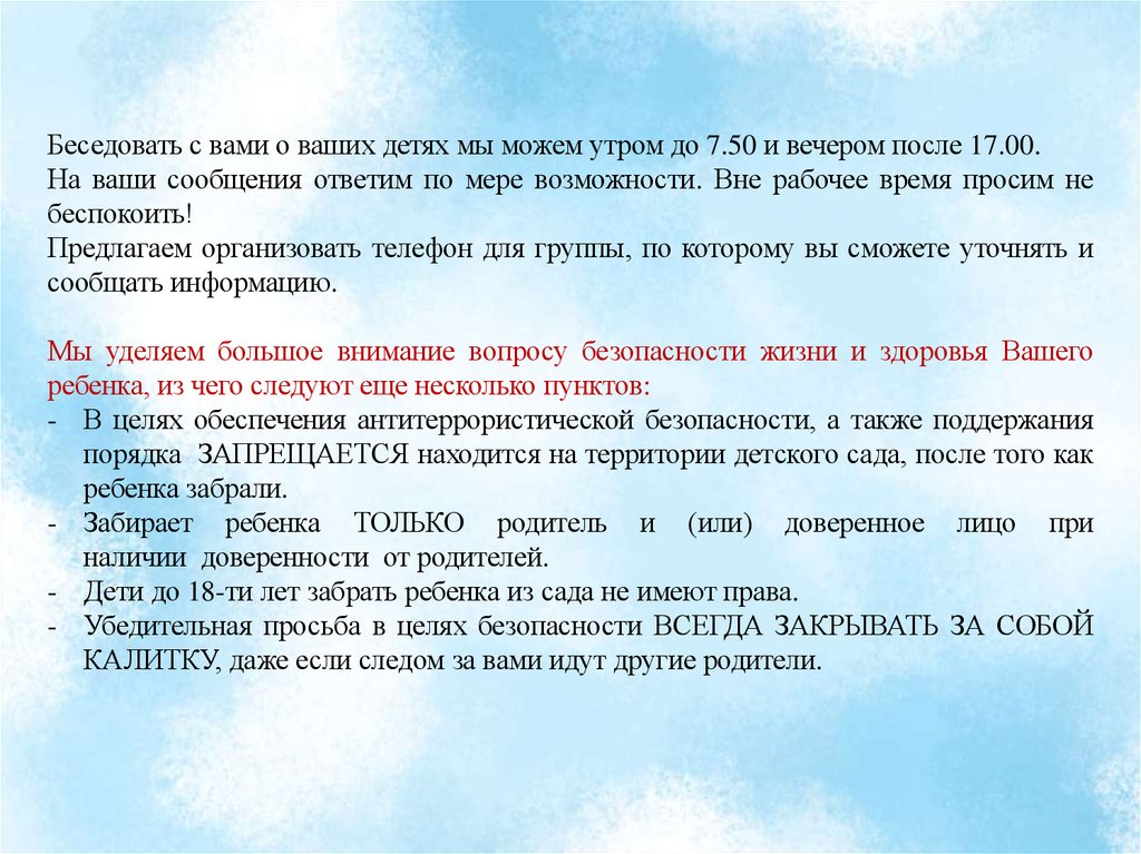 Беседовать с вами о ваших детях мы можем утром до 7.50 и вечером после 17.00.На ваши сообщения ответим по мере возможности. Вне рабочее время просим не