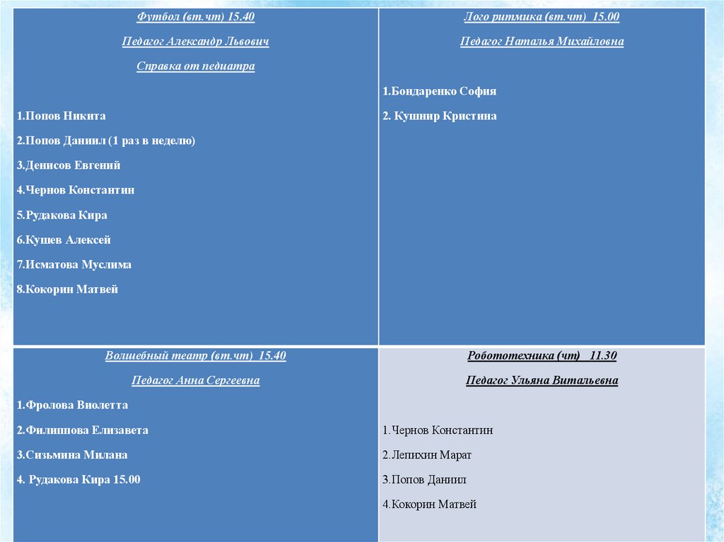 Футбол (вт.чт) 15.40Лого ритмика (вт.чт) 15.00