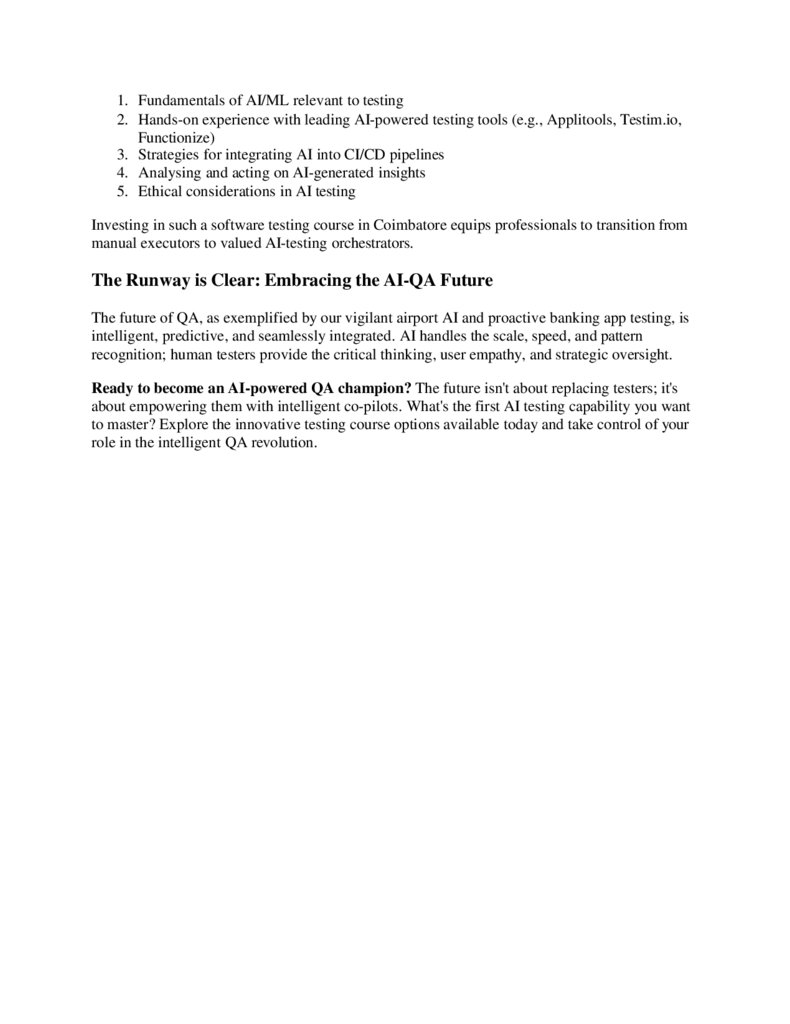 1. Fundamentals of AI/ML relevant to testing2. Hands-on experience with leading AI-powered testing tools (e.g., Applitools, Testim.io,