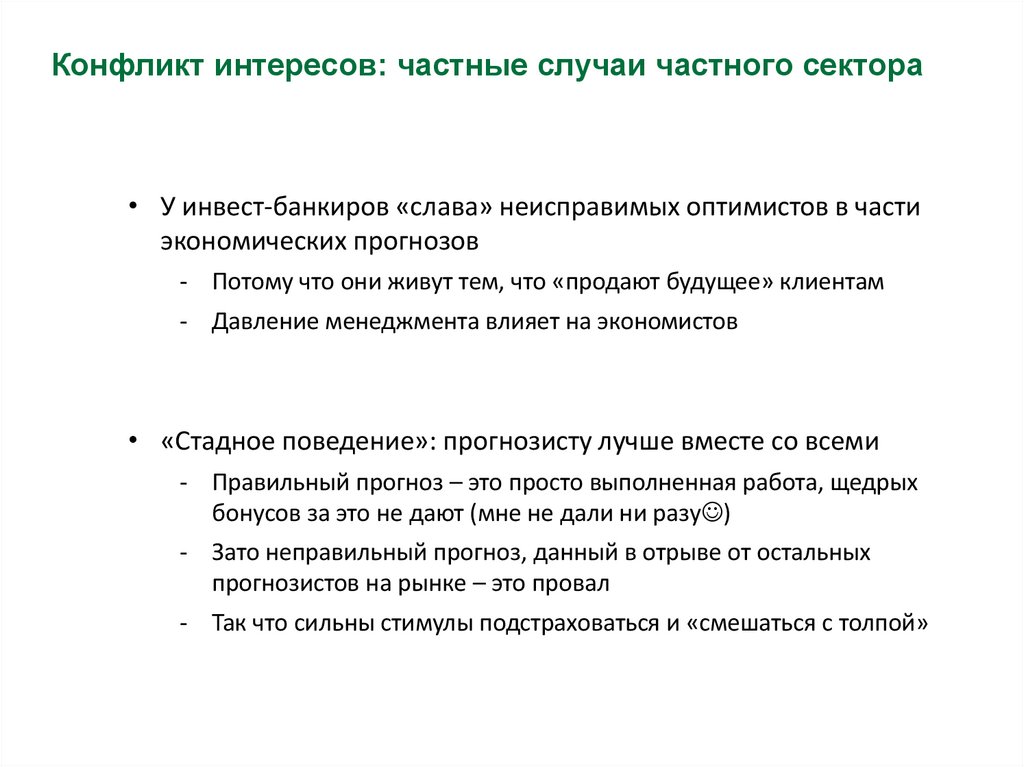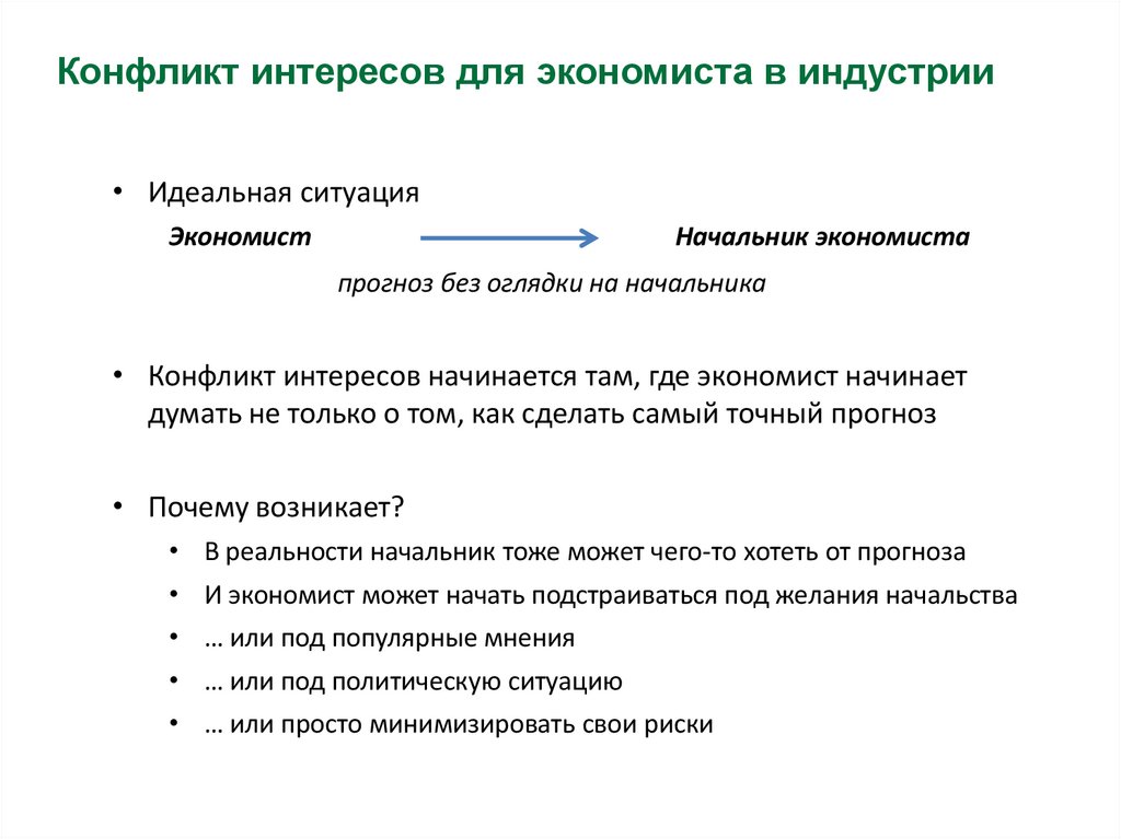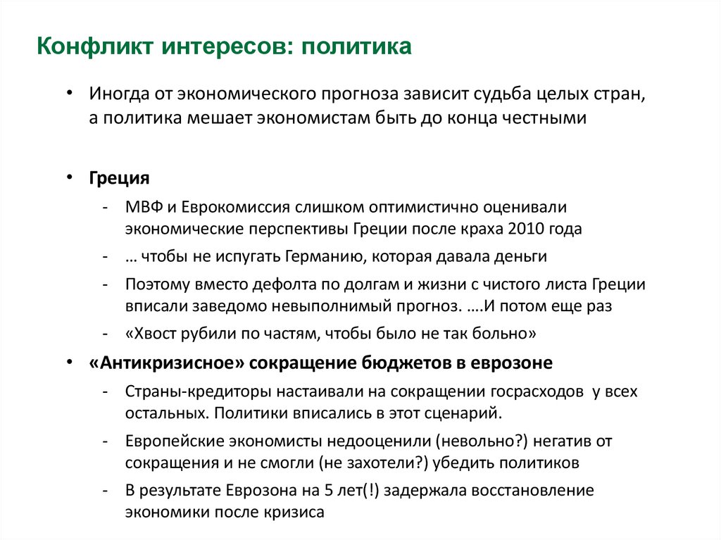 Конфликт интересов: политика• Иногда от экономического прогноза зависит судьба целых стран,