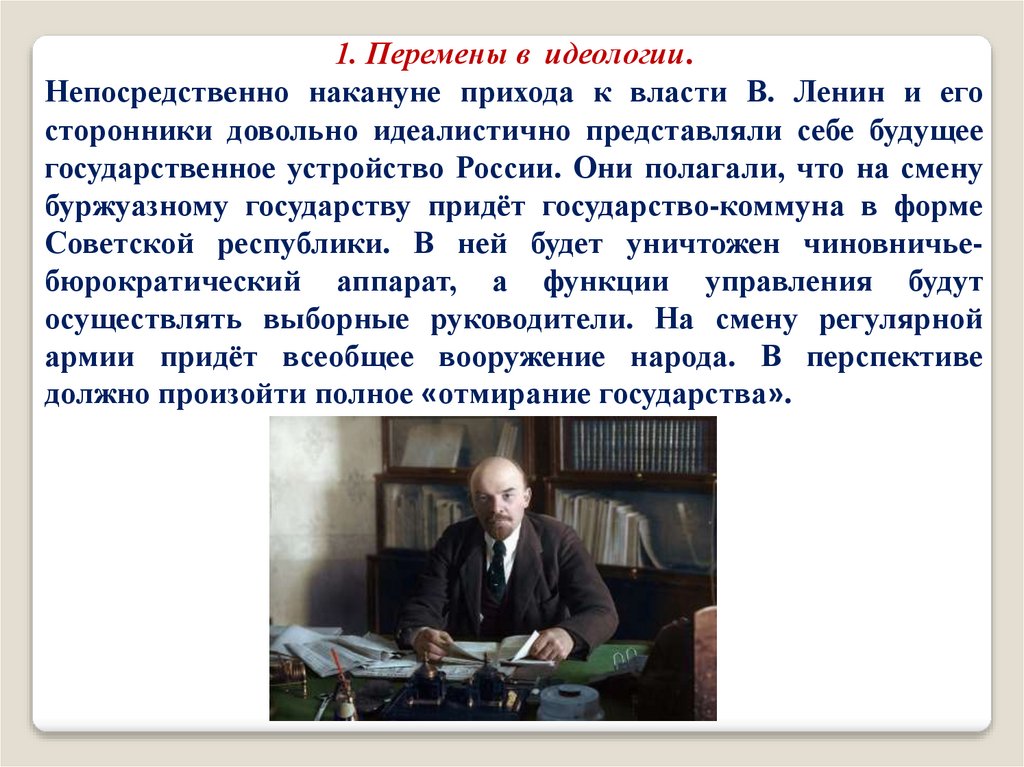 1. Перемены в идеологии.Непосредственно накануне прихода к власти В. Ленин и его