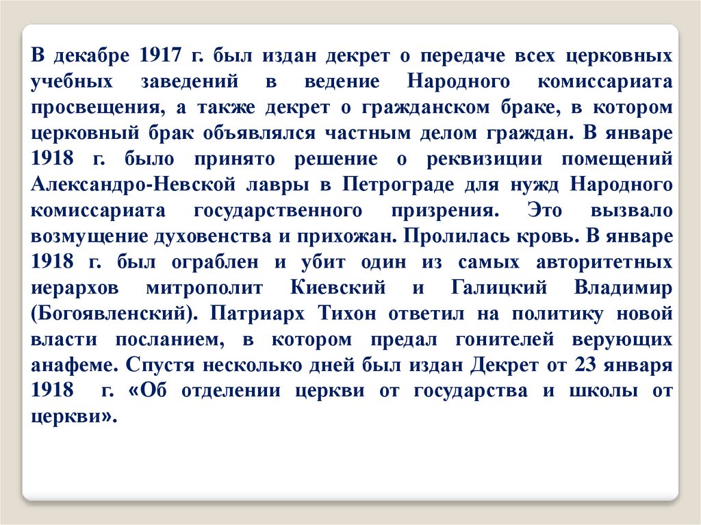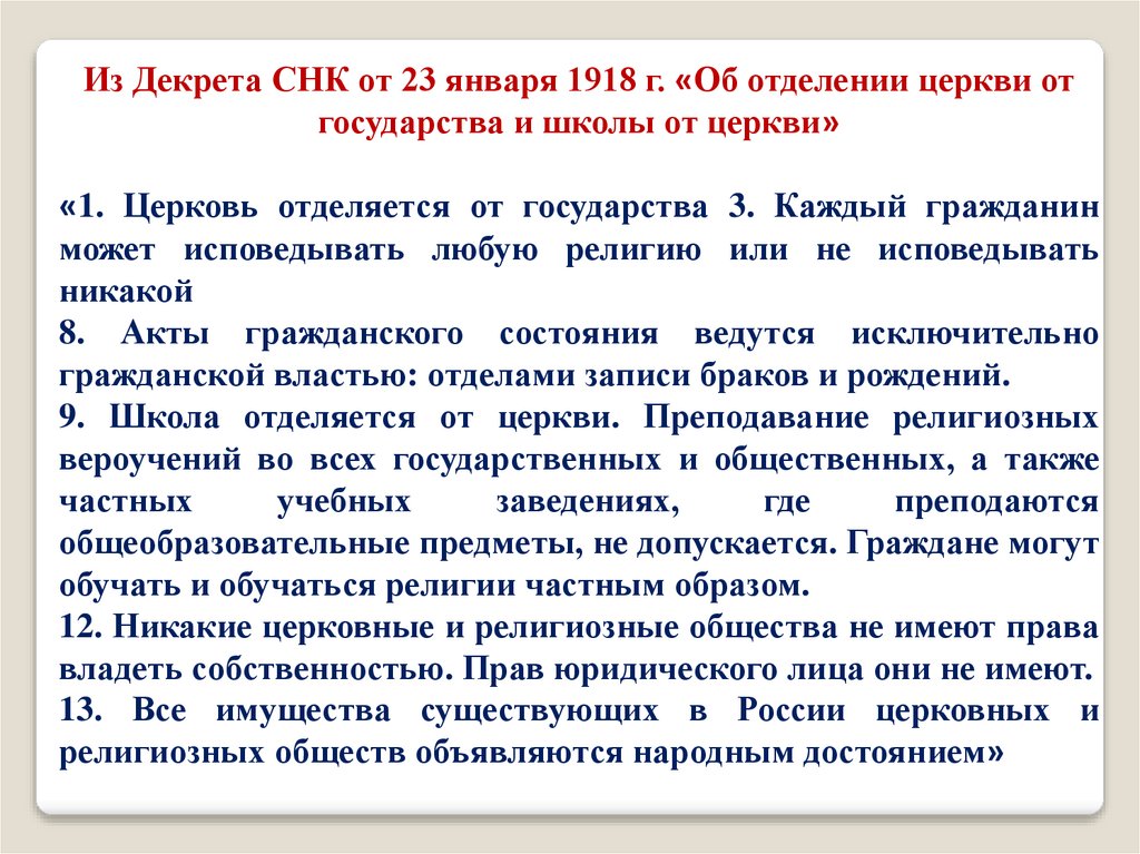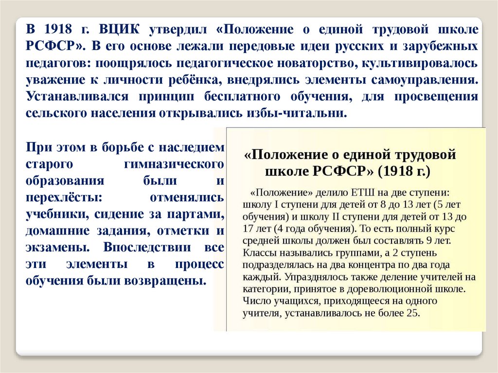 В 1918 г. ВЦИК утвердил «Положение о единой трудовой школеРСФСР». В его основе лежали передовые идеи русских и зарубежных