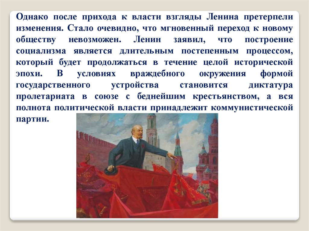 Однако после прихода к власти взгляды Ленина претерпелиизменения. Стало очевидно, что мгновенный переход к новому