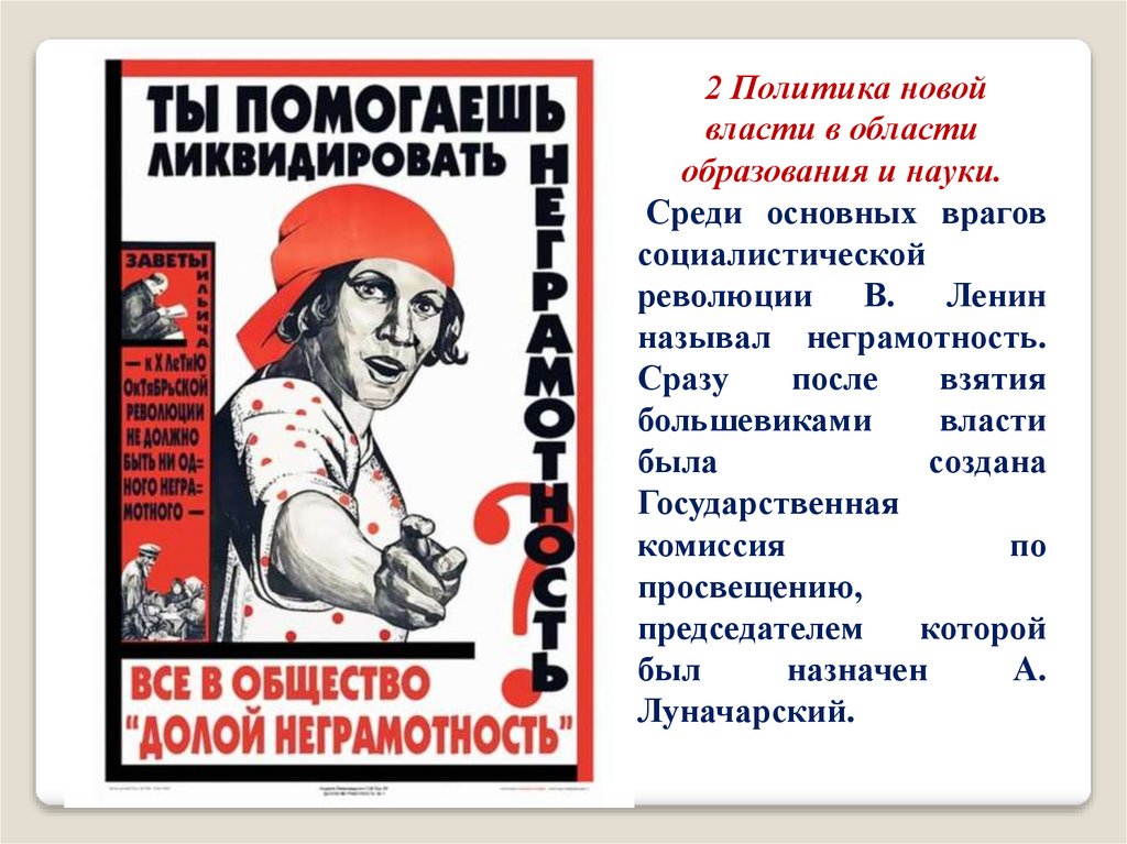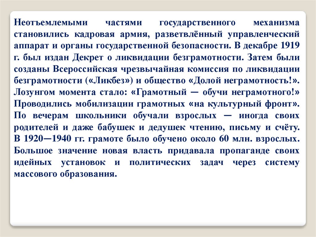 г. был издан Декрет о ликвидации безграмотности. Затем были