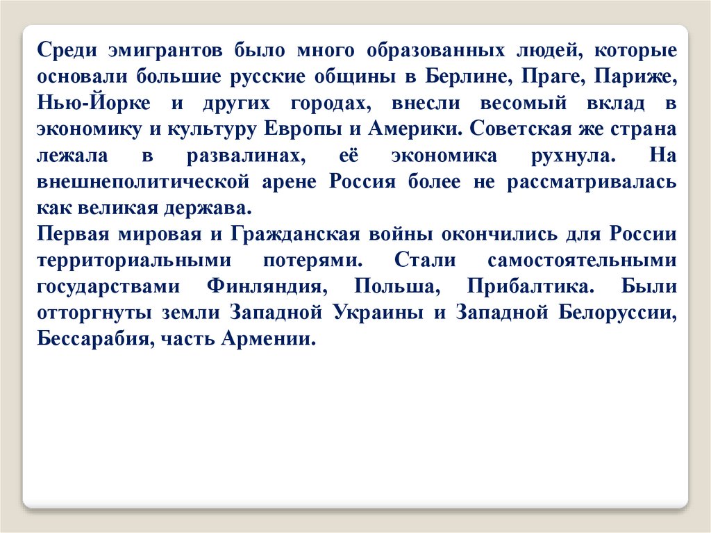 Среди эмигрантов было много образованных людей, которыеосновали большие русские общины в Берлине, Праге, Париже,