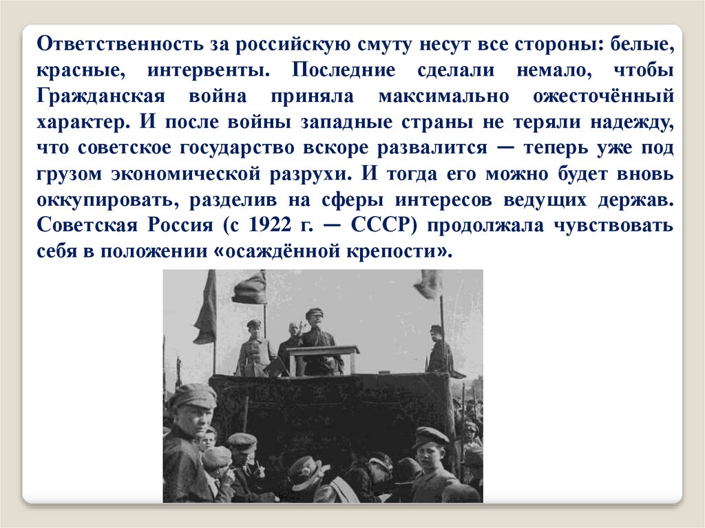 Ответственность за российскую смуту несут все стороны: белые,красные, интервенты. Последние сделали немало, чтобы