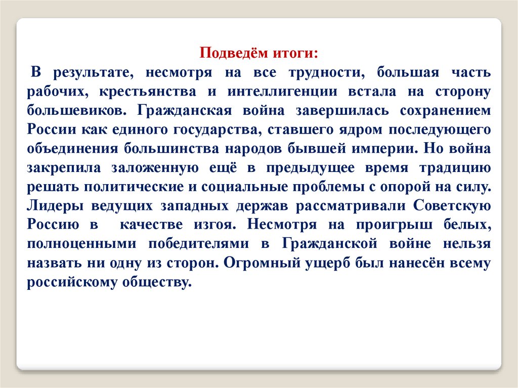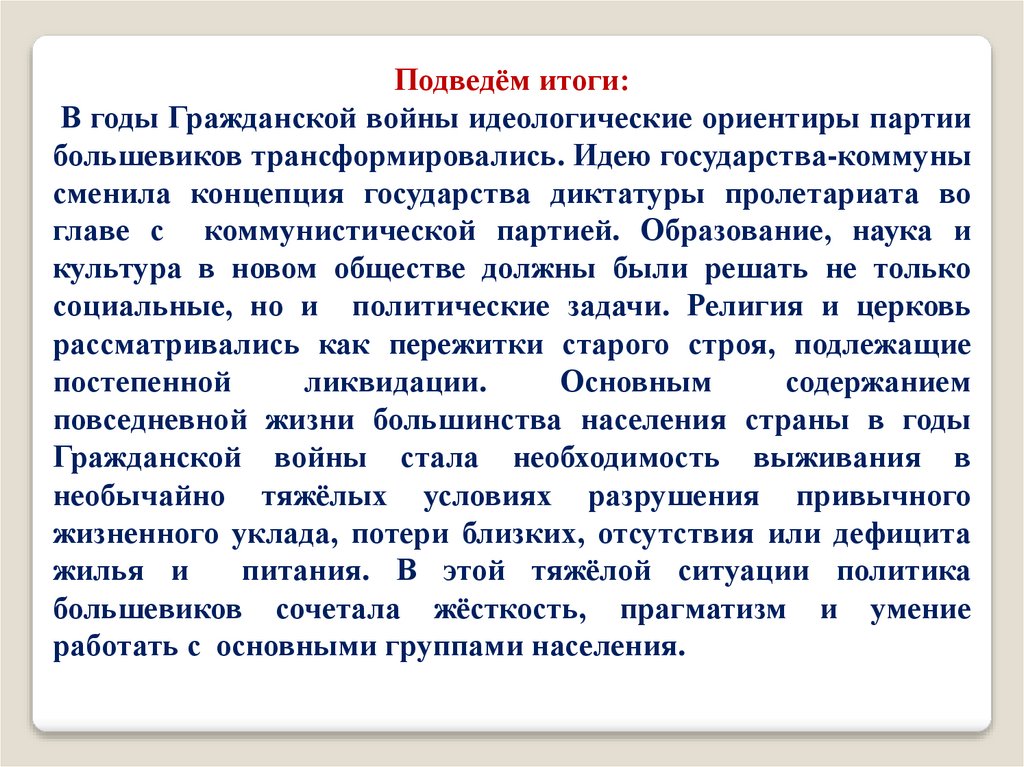 Подведём итоги:В годы Гражданской войны идеологические ориентиры партии