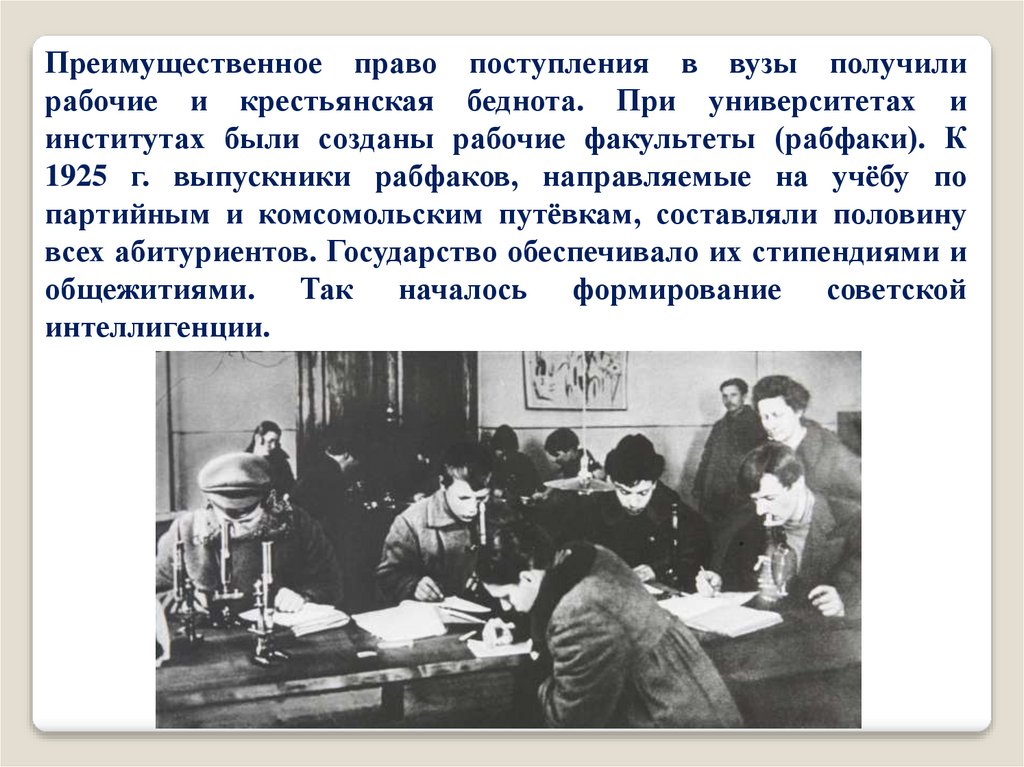 Преимущественное право поступления в вузы получилирабочие и крестьянская беднота. При университетах и