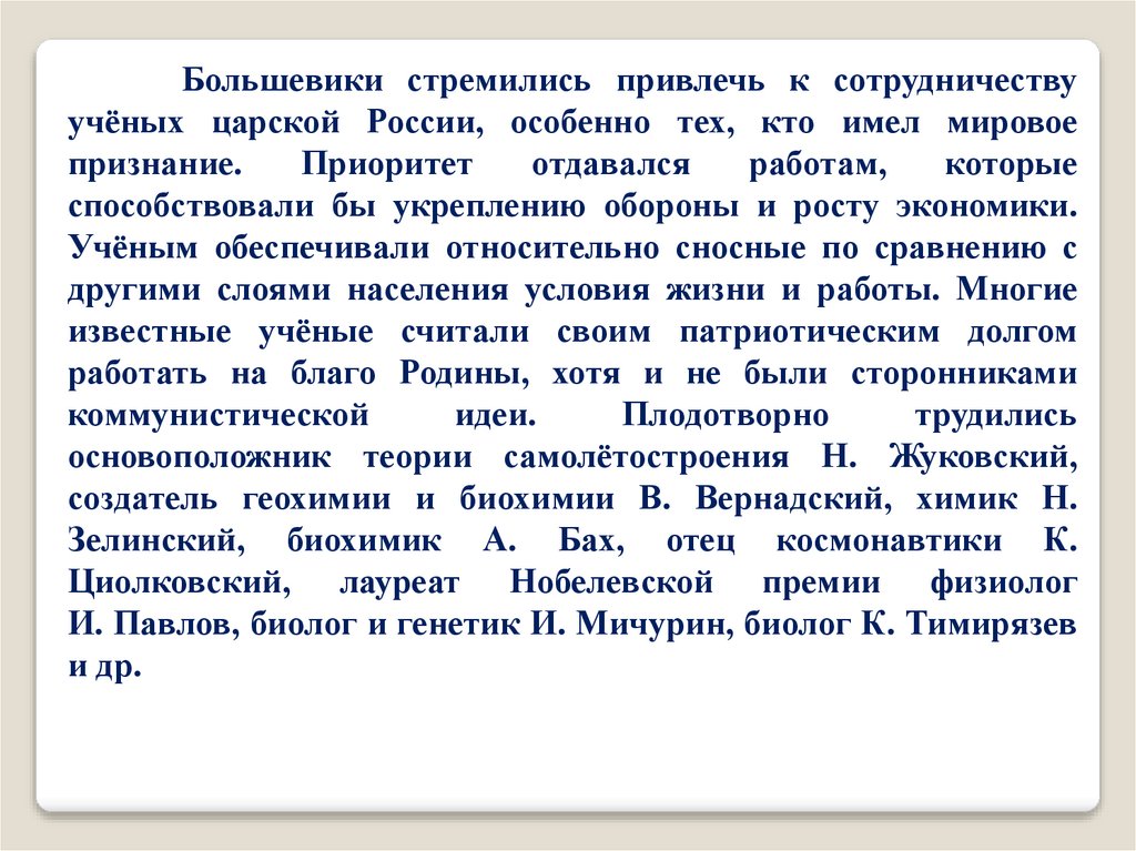 Большевики стремились привлечь к сотрудничествуучёных царской России, особенно тех, кто имел мировое