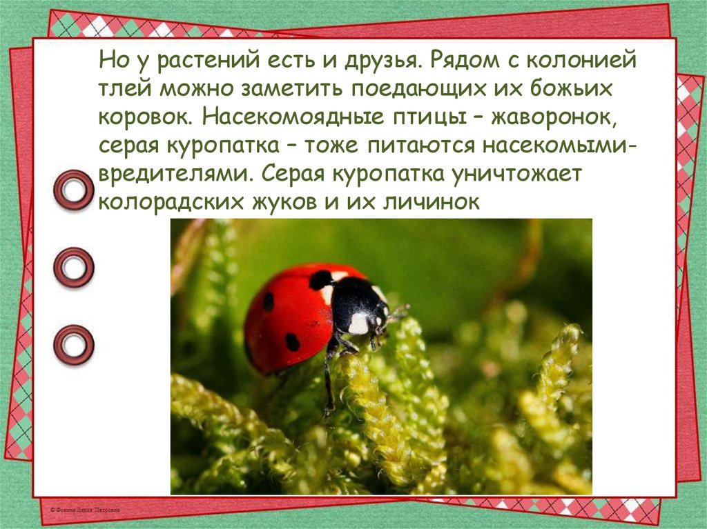 Но у растений есть и друзья. Рядом с колониейтлей можно заметить поедающих их божьих