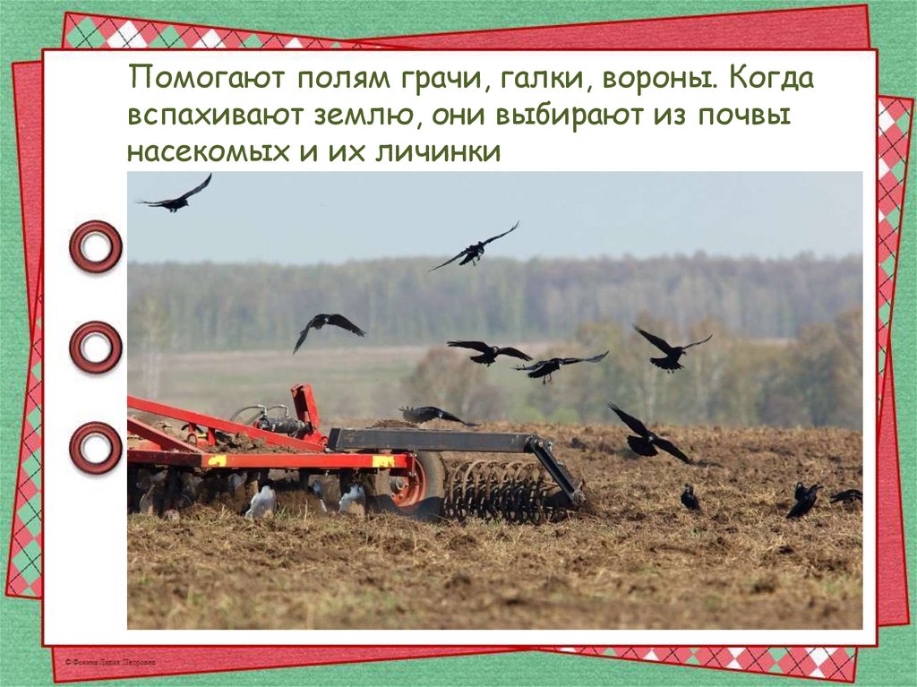 Помогают полям грачи, галки, вороны. Когдавспахивают землю, они выбирают из почвы