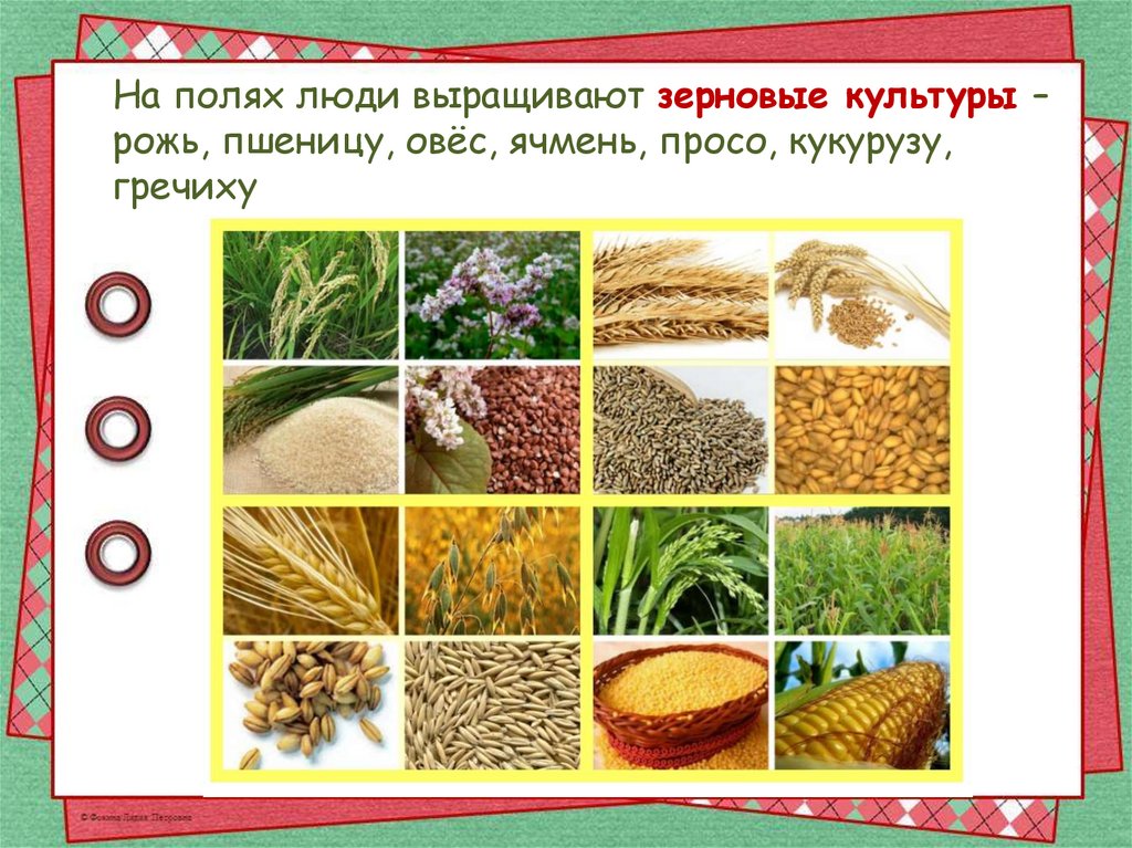 На полях люди выращивают зерновые культуры –рожь, пшеницу, овёс, ячмень, просо, кукурузу,