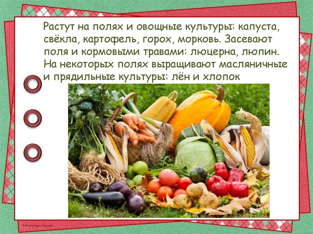 Растут на полях и овощные культуры: капуста,свёкла, картофель, горох, морковь. Засевают
