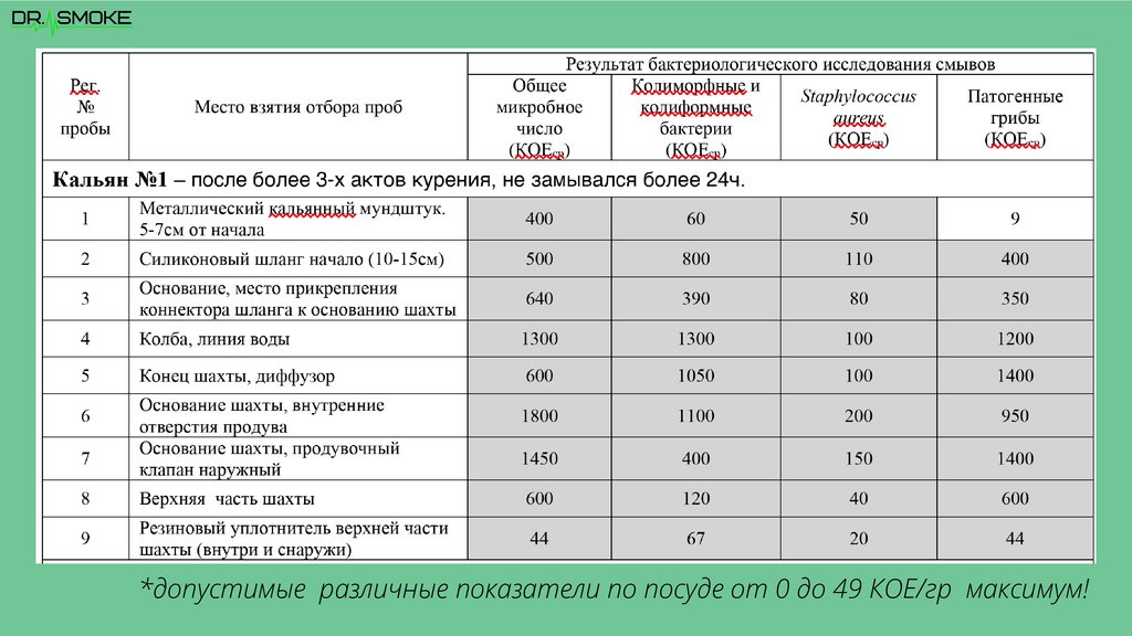 *допустимые различные показатели по посуде от 0 до 49 КОЕ/гр максимум!5.