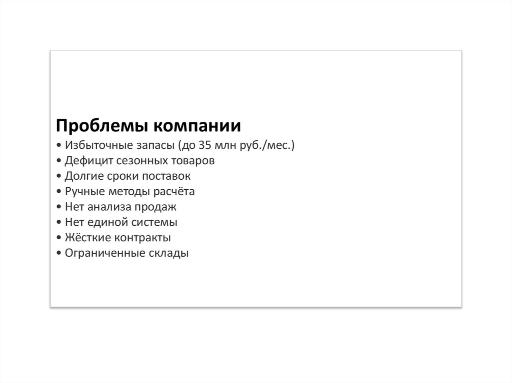 Проблемы компании• Избыточные запасы (до 35 млн руб./мес.)