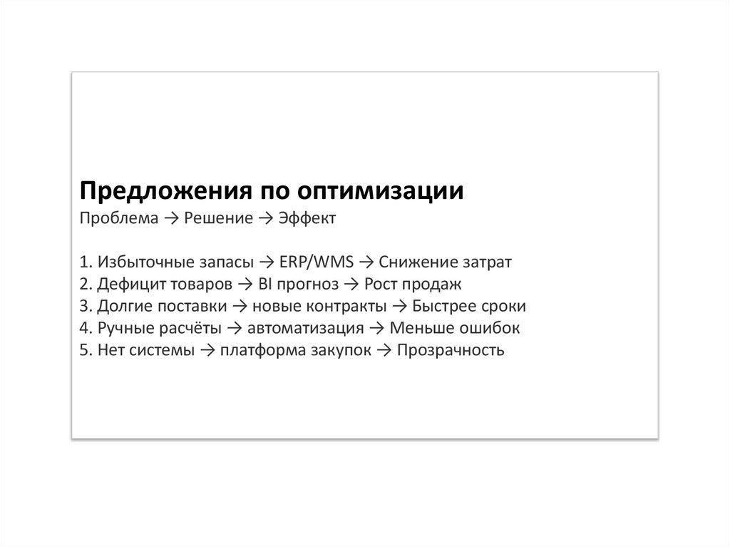 Предложения по оптимизацииПроблема → Решение → Эффект