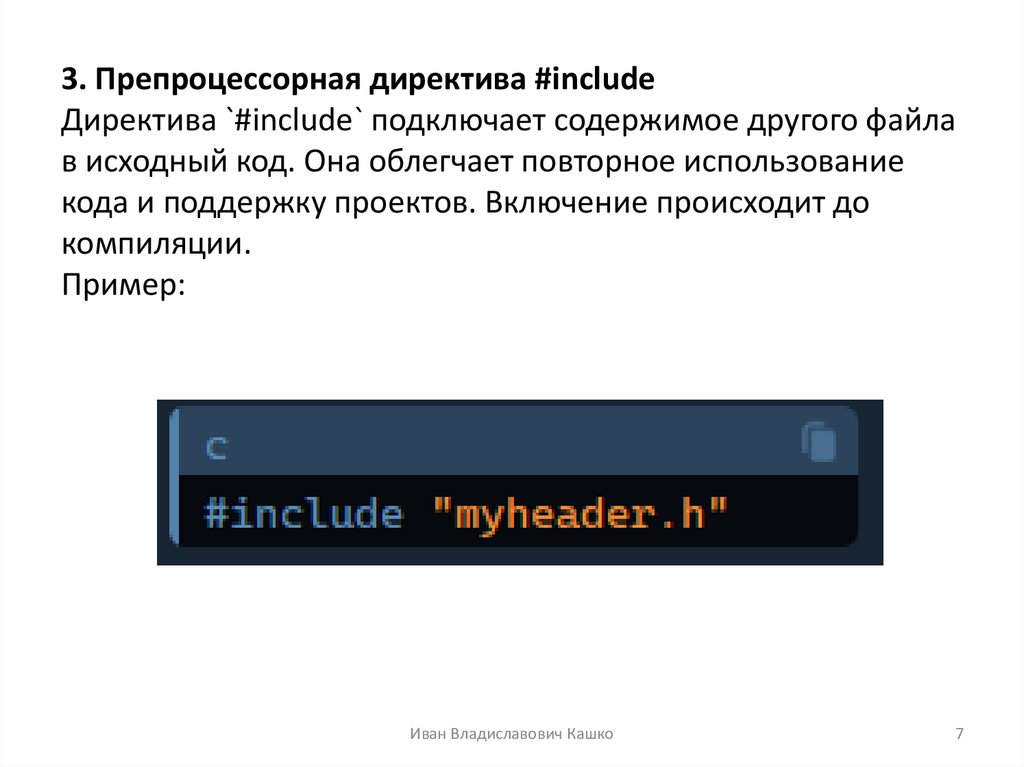 3. Препроцессорная директива #includeДиректива `#include` подключает содержимое другого файла