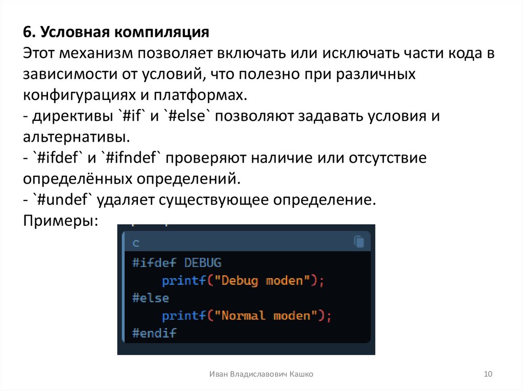6. Условная компиляцияЭтот механизм позволяет включать или исключать части кода в