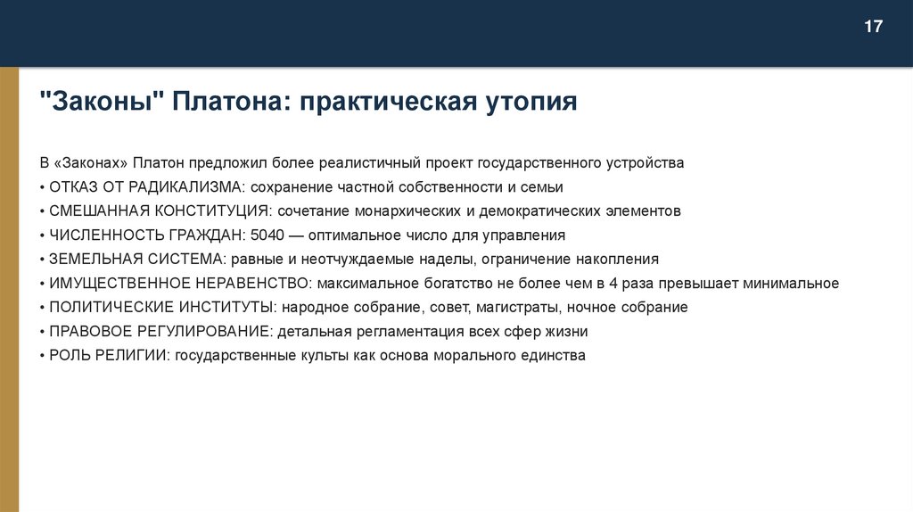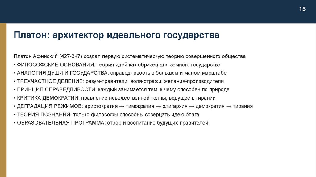 • КОНЦЕПЦИЯ ВЛАСТИ: править должны те, кто понимает логос, а не популярные у толпы