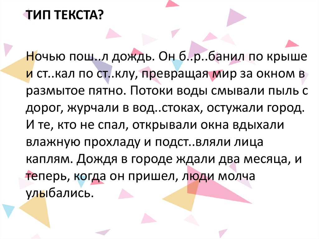 ТИП ТЕКСТА?Ночью пош..л дождь. Он б..р..банил по крыше