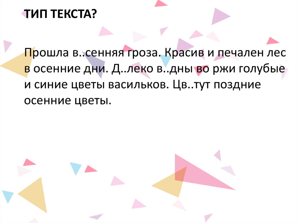 ТИП ТЕКСТА?Прошла в..сенняя гроза. Красив и печален лес
