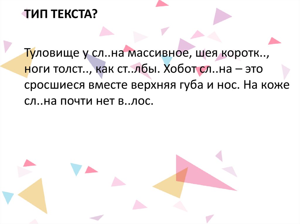 ТИП ТЕКСТА?Туловище у сл..на массивное, шея коротк..,