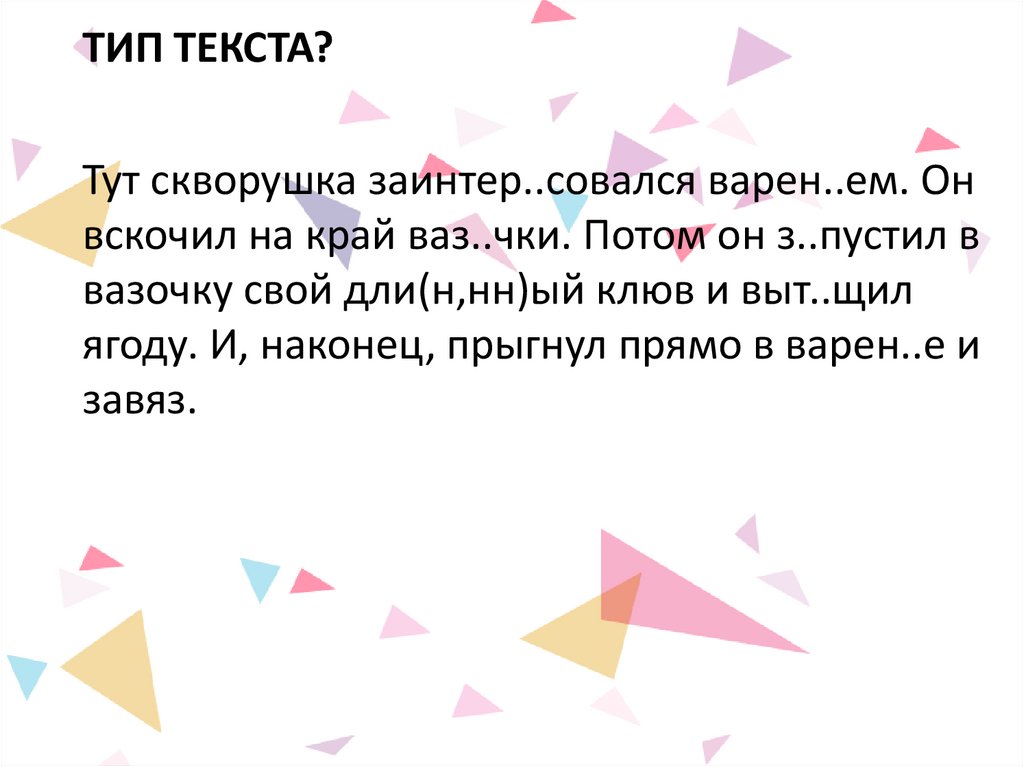 ТИП ТЕКСТА?Тут скворушка заинтер..совался варен..ем. Он