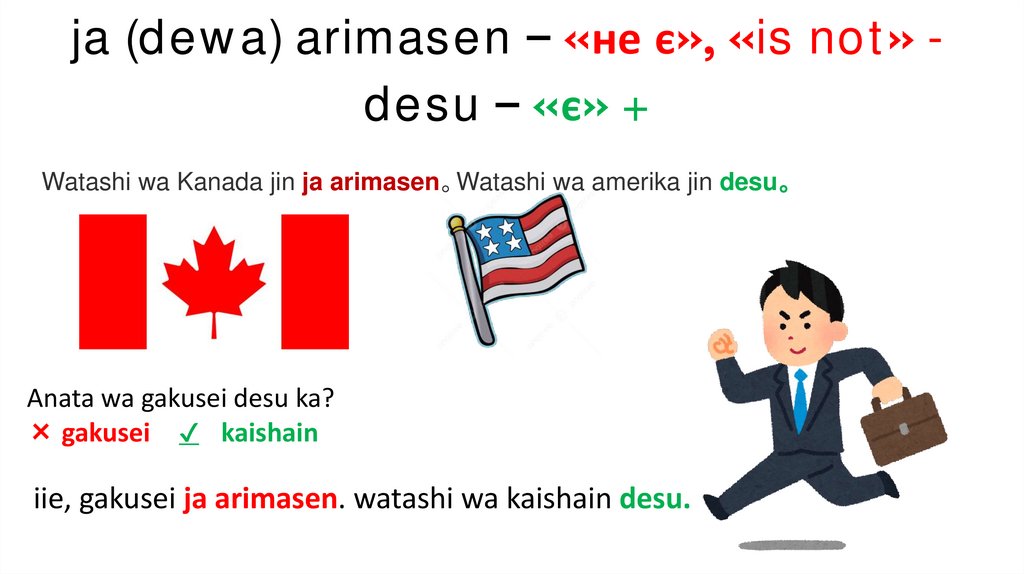 Watashi wa Kanada jin ja arimasen。Watashi wa amerika jin desu。
