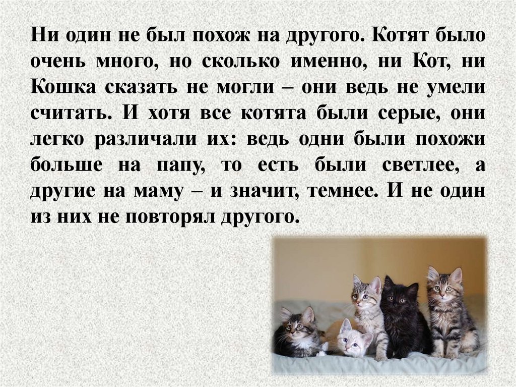 Ни один не был похож на другого. Котят былоочень много, но сколько именно, ни Кот, ни